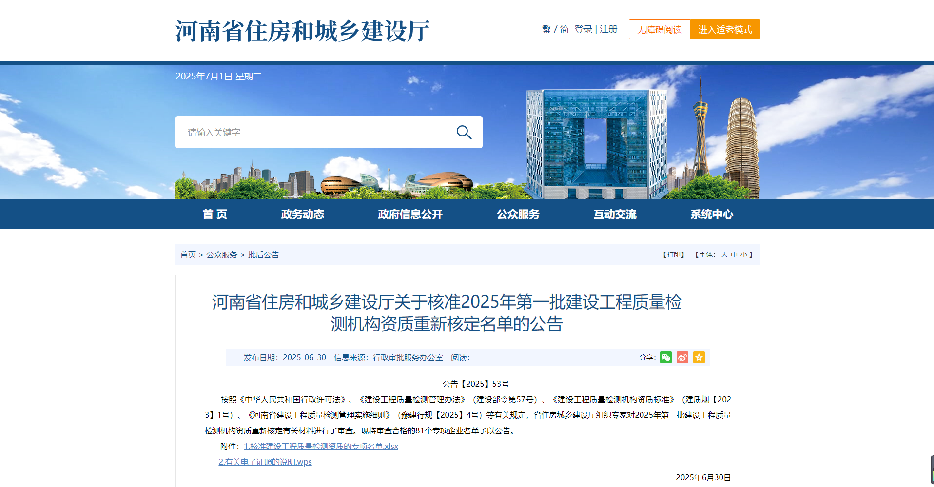 熱烈祝賀我司通過河南省住建廳2025年第一批建設(shè)工程質(zhì)量檢測機(jī)構(gòu)資質(zhì)重新核定?。。?